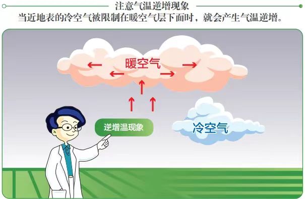 逆增溫發(fā)生在地表冷卻時的夜晚。在這種情況下,即使有微風,也很少有空氣的混合。如果早上噴霧太早,此時氣溫還很低,那么小霧滴就會在防治區(qū)上方持續(xù)懸浮很長時間,直到風吹來,將霧滴飄移云帶到敏感區(qū)而導致嚴重的損害。為避免逆溫產(chǎn)生的問題,需要等到日出后氣溫增加2-3°C時再噴霧。